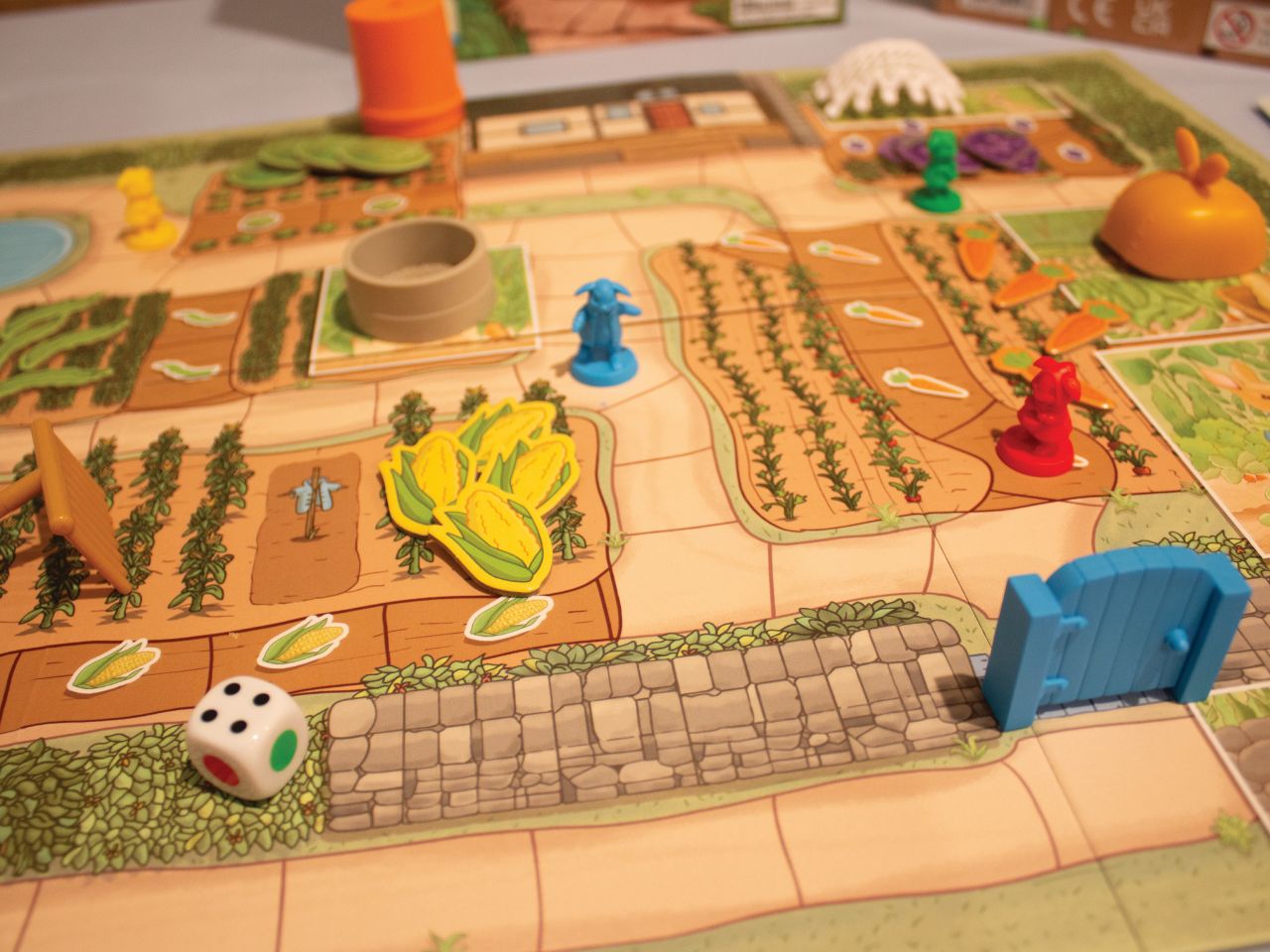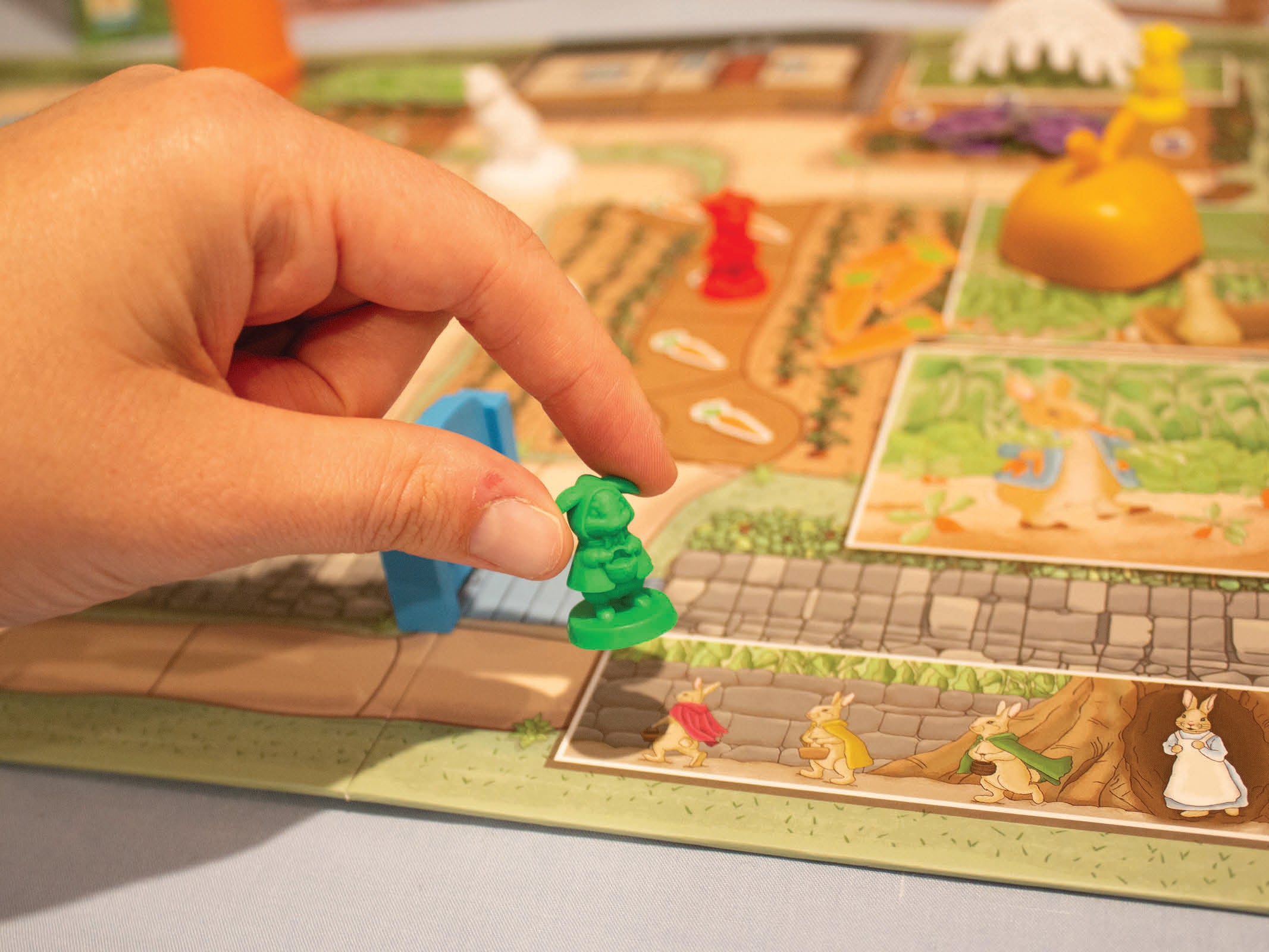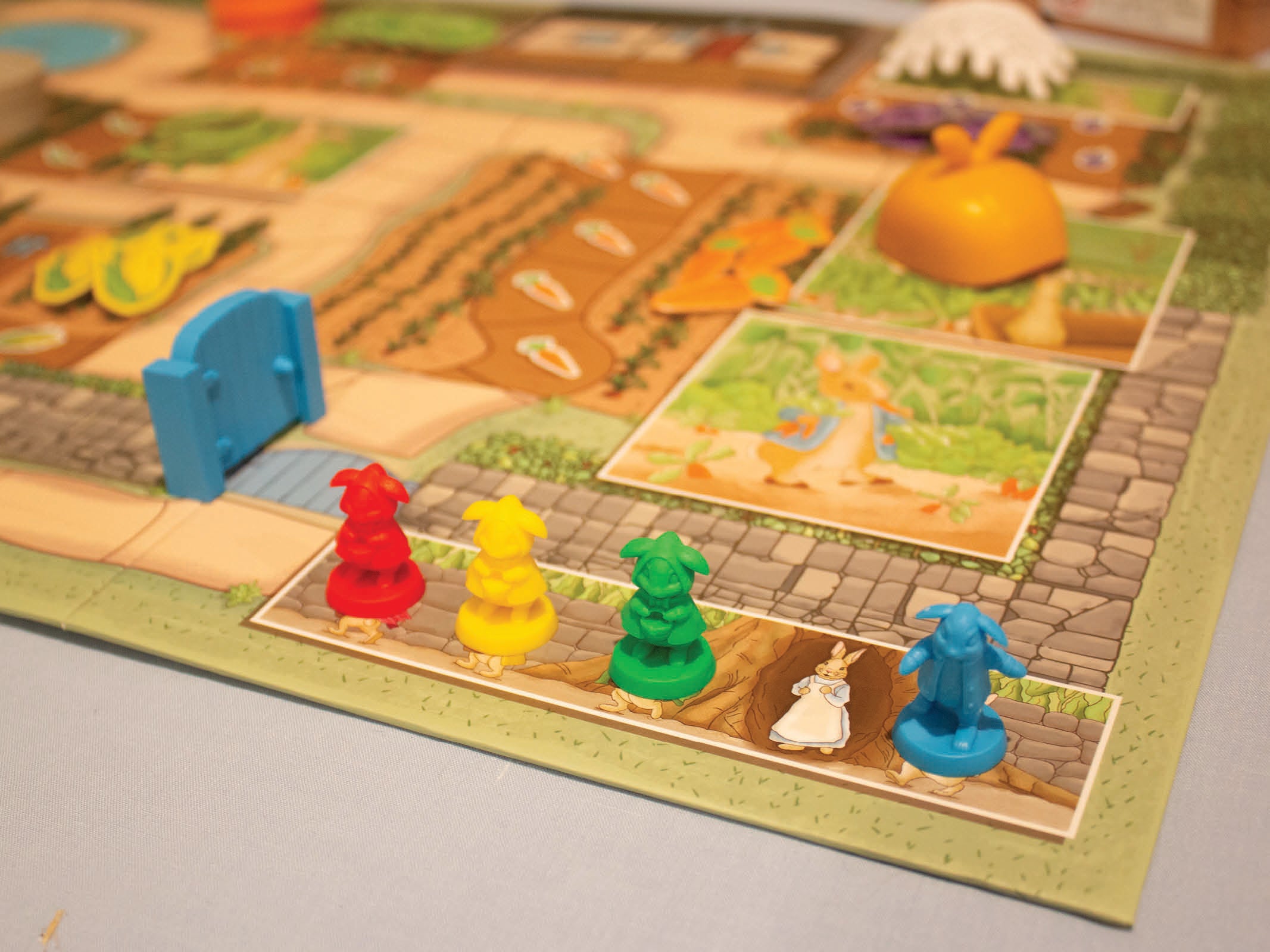 - Board Layout: Place the board in the center, with the rabbits’ sand-bank home in one corner and Mr. McGregor’s Garden™ across from it.