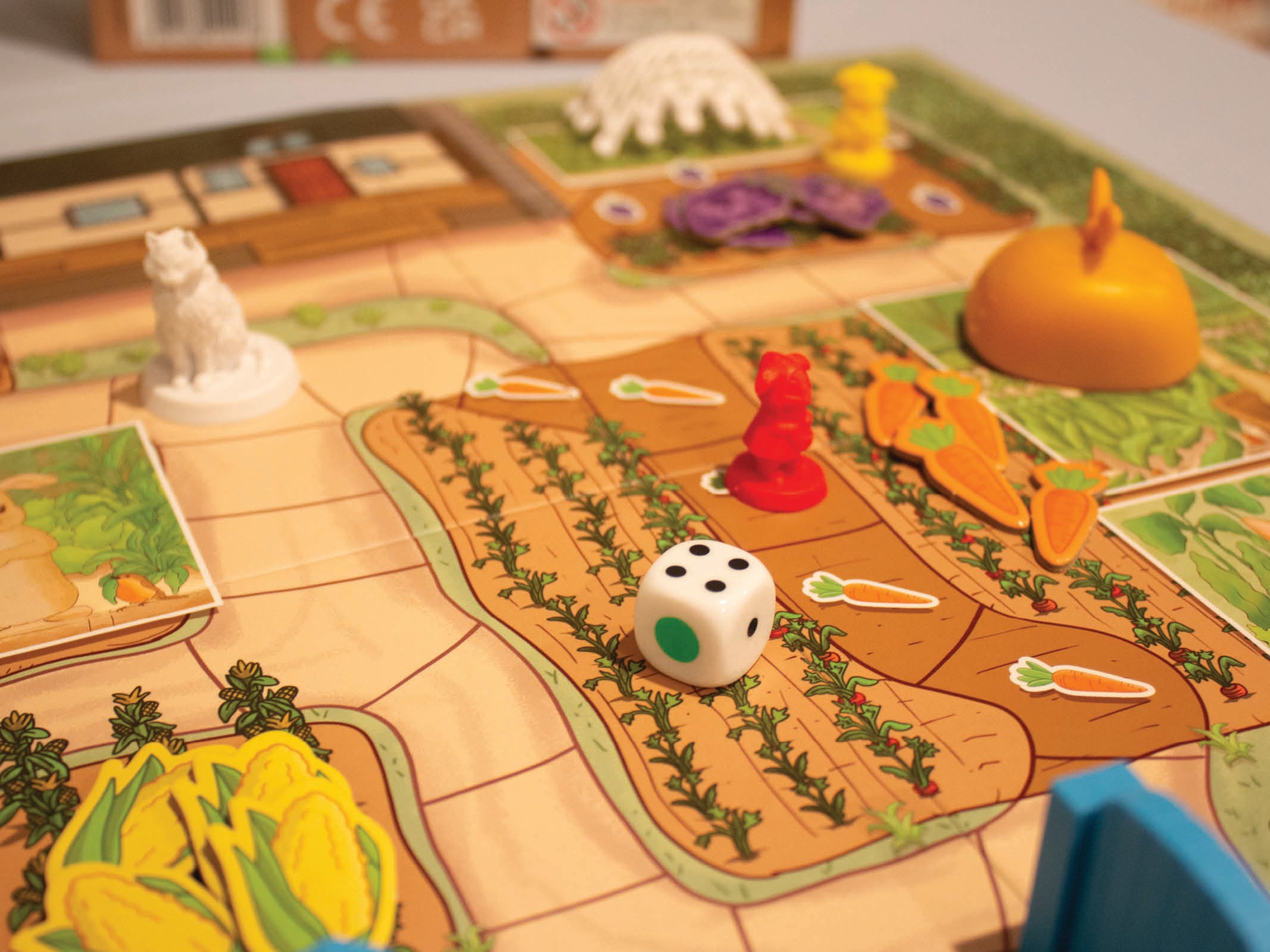 Returning Home: When your rabbit is just one space away from the sand-bank home and you roll a 2, 3, or 4, you may move directly into the burrow, winning the game if you have collected all five produce items.