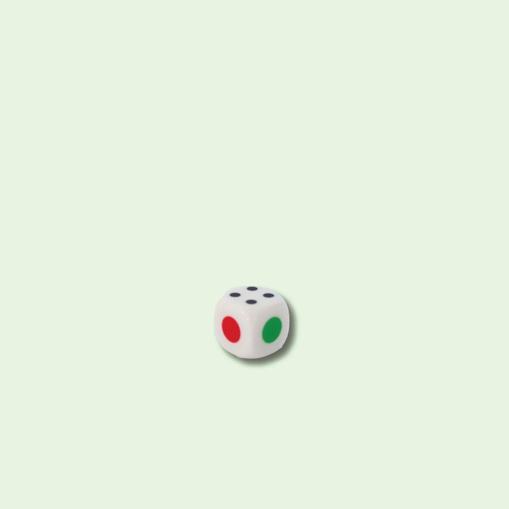 There is one die. It has the numbers 1 to 4 on it and one side it is coloured red, and one side it is coloured green. The die is rolled, and if a number turns up, the player moves their rabbit that number of spaces in one direction (on a given turn, you cannot move some spaces forward then some backward—you must move on each turn in only one direction).